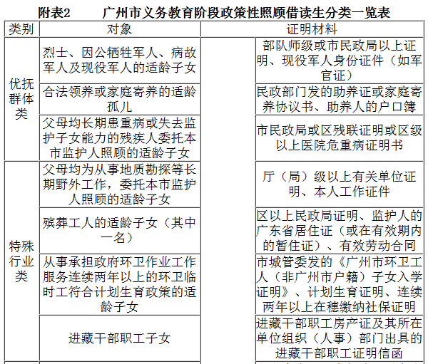 2.广州市义务教育阶段政策性照顾借读生分类一览表